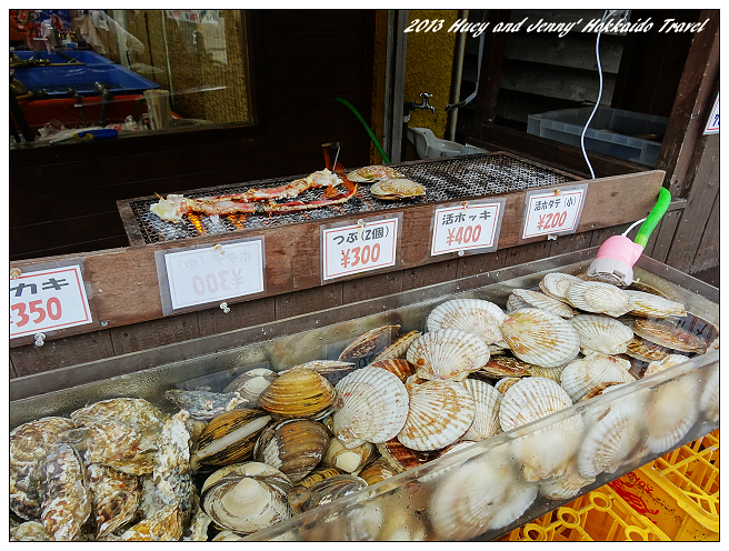 路邊有幾家商店販賣烤扇貝、帝王蟹腳、烤牡蠣,吃東西喘口氣