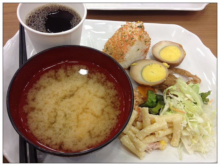 ▲肉丸子、滷蛋、通心麵,重複率比較低的菜色,其他飯糰、味增湯、沙拉、醬菜是固定班底。