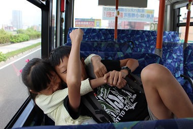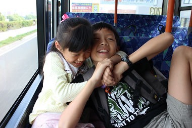 ▲ 走了一段路,可以搭車坐下休息。兩小不知在HIGH什麼,一路上吵吵鬧鬧。