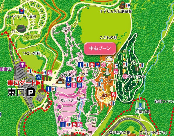 ▲ 從左邊的入口一直往右走,會到達(21)子供之谷 ( 兒童之谷 )和(23)森のすみか( 森之住處 )