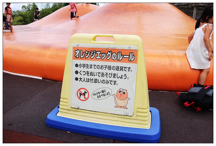 彈跳床的告示牌,第一句正確的中文解釋是,僅提供給小學生(含)以下的孩子遊戲的遊樂設施。配合第三句需由大人陪同(是指大人需在旁督促,和過小的孩子爸媽可協助保護)。 基本上第一句就已經是代表大人不能玩的意思,如果小孩已經夠大了,大人的確是不能上去,照片上的那位日本媽媽的孩子還很小,是需要協助保護的,所以她坐在上面是沒問題的。 所以相信那位先生指是好意提醒不清楚日文告示的人而已,要不然你真的爬上去,再被叫下來,反而更不好看,所以別太在意。 另外日文本身就是較迂迴的,不較不會有直接否定句,所以下回可先觀察一下當地人的使用方式,再進行比較不會有誤會優。 謝謝你對於這公園的介紹,很詳細,也很吸引人,有想規劃去這個點呢!