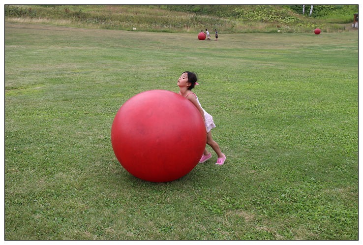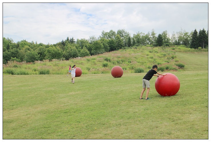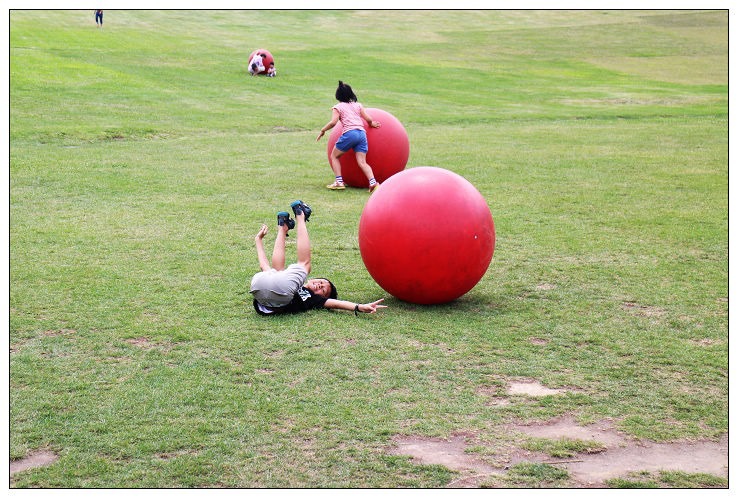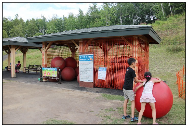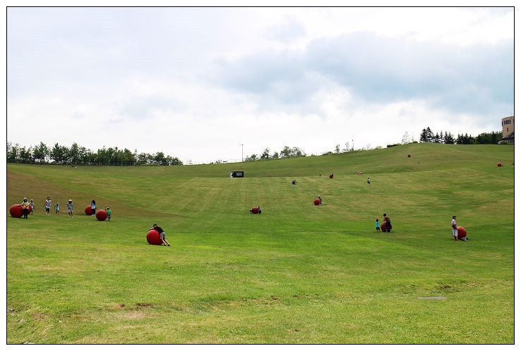 ▲ 左邊的小屋放了很多紅色的大滾球,可以自行取用,在這片廣大的山坡草地上推球上山。