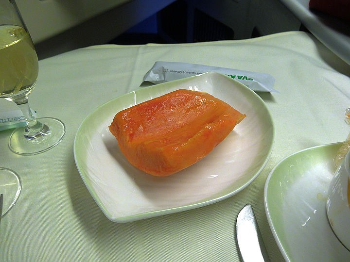 ▲餐後水果選擇木瓜。其實還有柳橙、蘋果、葡萄、百香果可以選,但是看到前一位乘客,