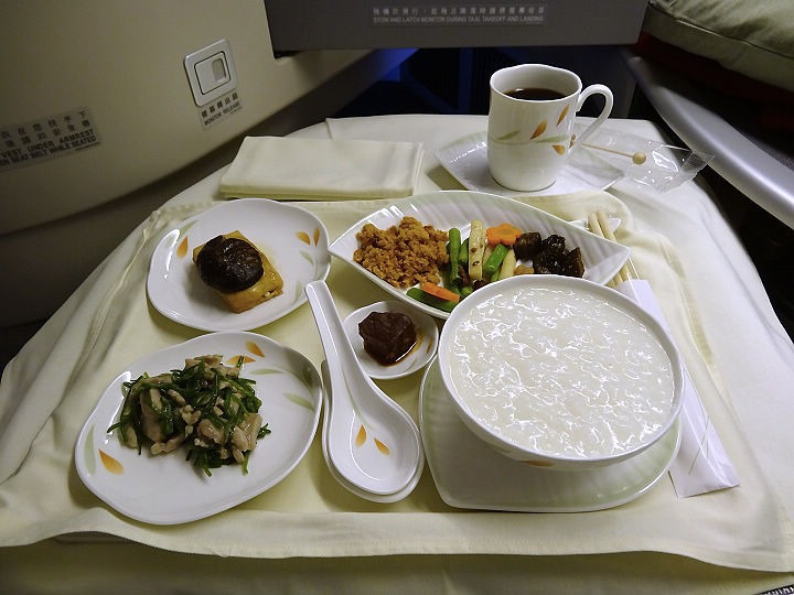 ▲ 睡醒之後,剛好空服員開始送早餐了,我點清粥小菜的套餐 + 第二杯咖啡。