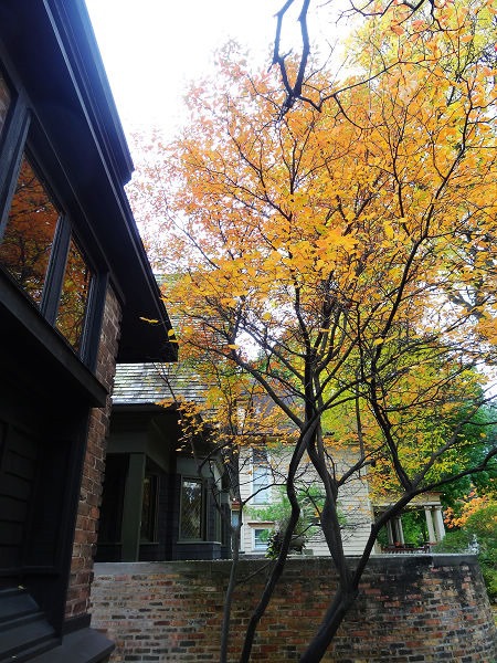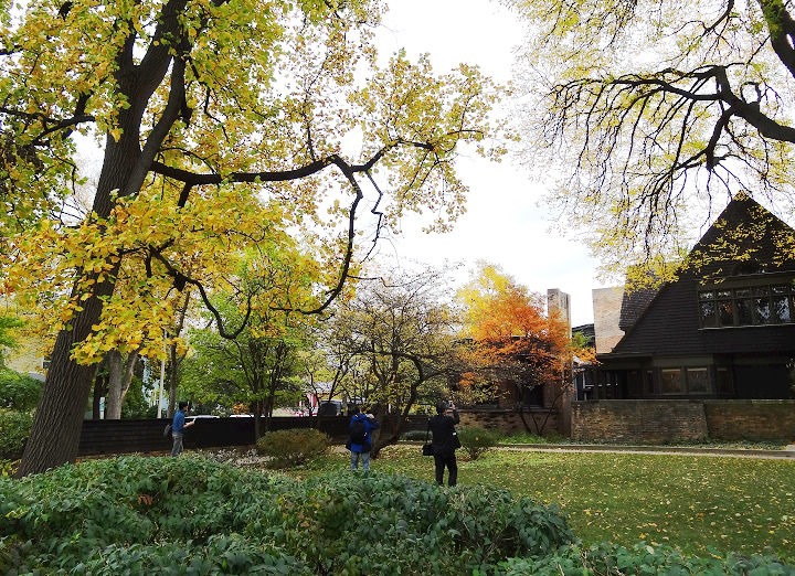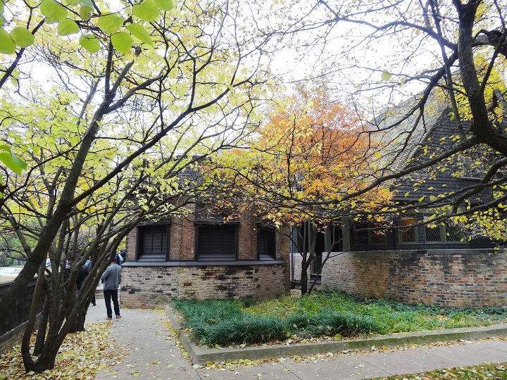 ▲ 左邊這棟是萊特的作品,泛黃的樹葉落在整片草地上,想必整理起來很辛苦吧。