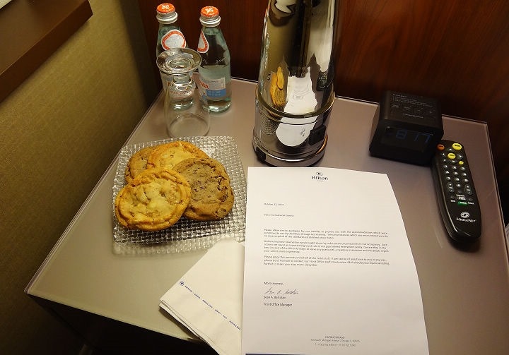 ▲ 回到房間,床頭的桌几放了礦泉水與餅乾,經理為了昨晚的事項我們致歉,並送上小禮物。