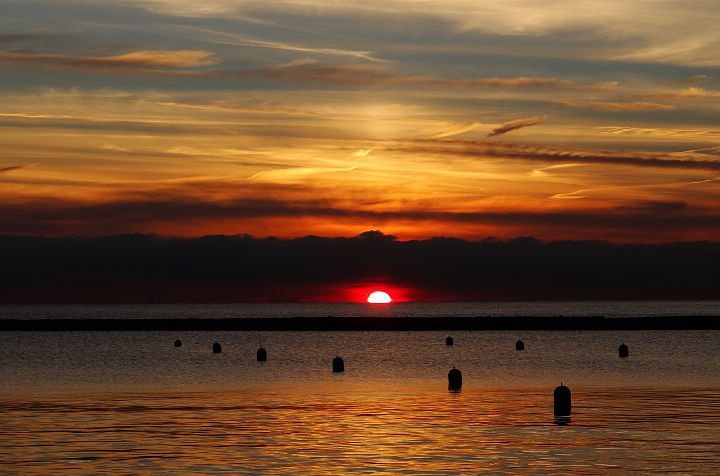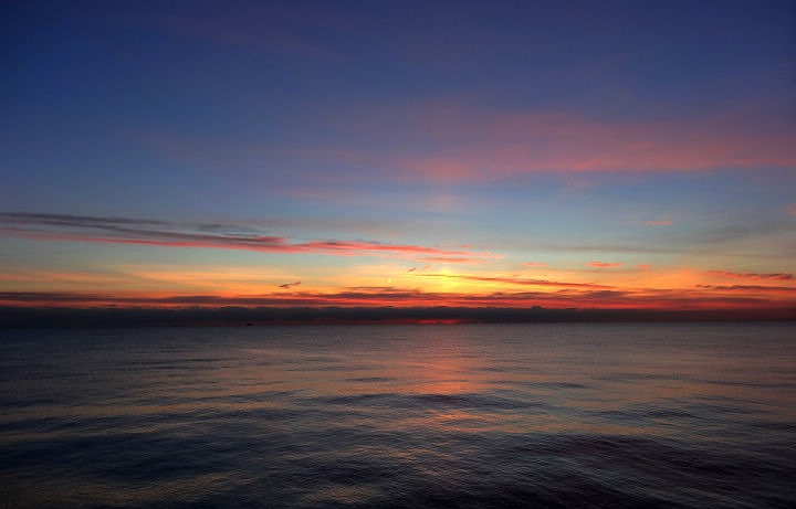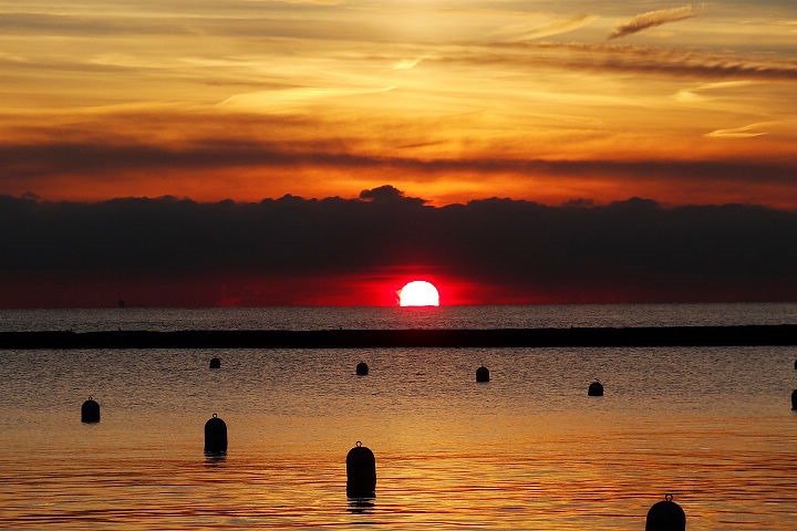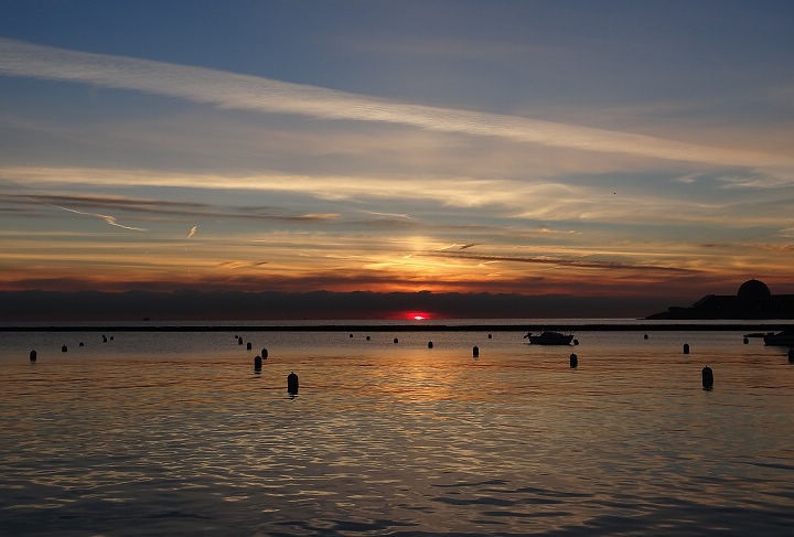 ▲ 湖面遊艇與日出相互輝映的畫面,祥和又平靜。太陽短暫露臉,一下子離開水面鑽到雲層裡了。