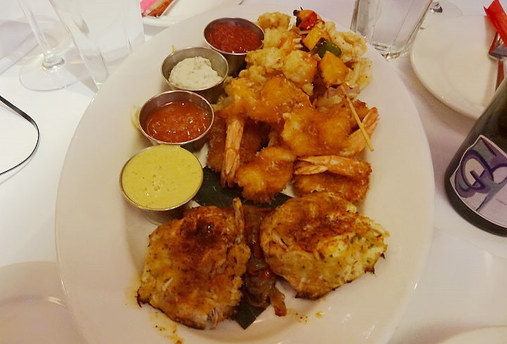 海鮮拼盤,螃蟹、炸蝦、炸花枝與干貝串。