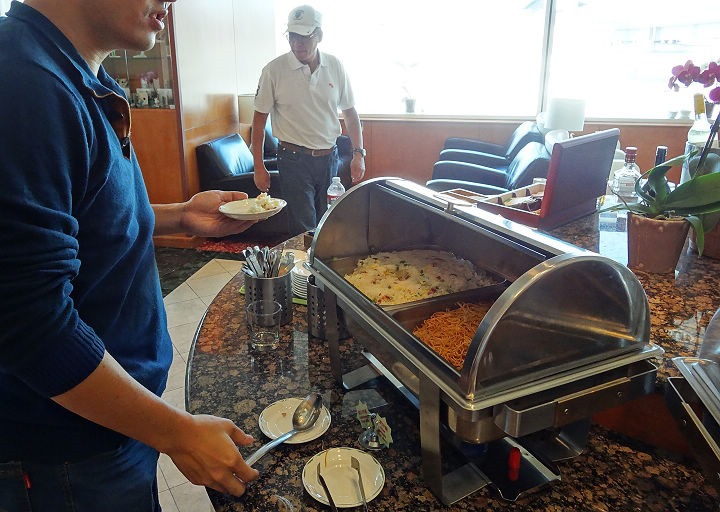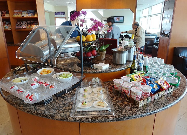 一進門分兩區,休息區和餐點區。餐點區有茶、咖啡、酒類的飲料可選用,旁邊有日清的泡麵。