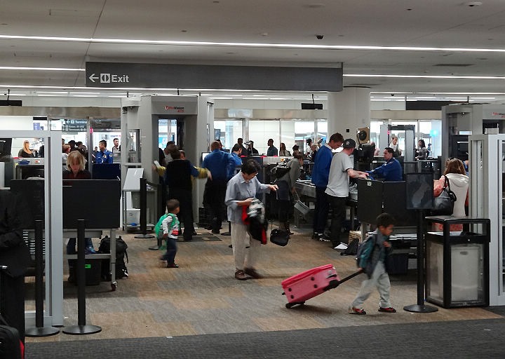 往登機門的方向移動,經過安檢區,一樣是兵荒馬亂的場景。