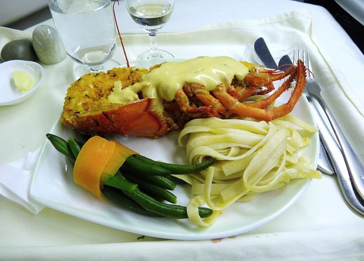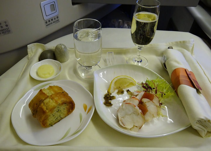 點了杯香檳佐餐,前菜是冷盤龍蝦,蒜味麵包配上後面的濃湯。