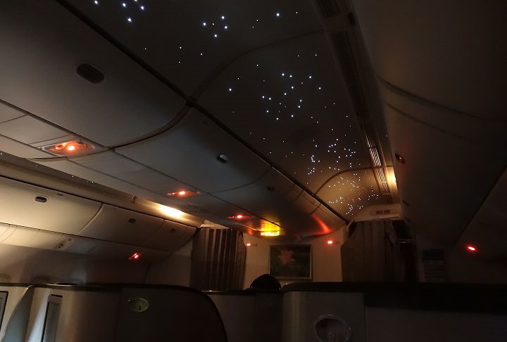 餐後沒多久,進入安靜的飛行睡眠模式,天花板還出現星空圖案,太有氣氛了。
