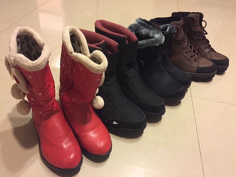 奇妙的是,年紀越小,鞋子越大 從左邊起依序是妹妹、哥哥、媽咪,最右邊才是爸爸的鞋。