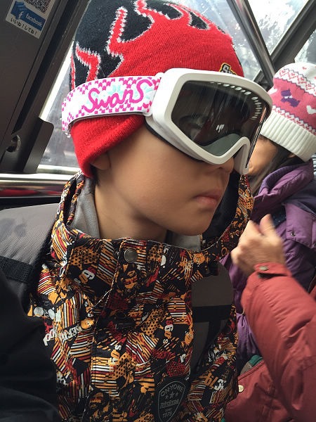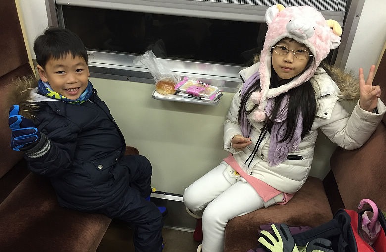 同車的一位老婆婆,見到外國的孩子似乎也頗為好奇,熱心地跟媽咪聊天,得知我們是來玩雪的,