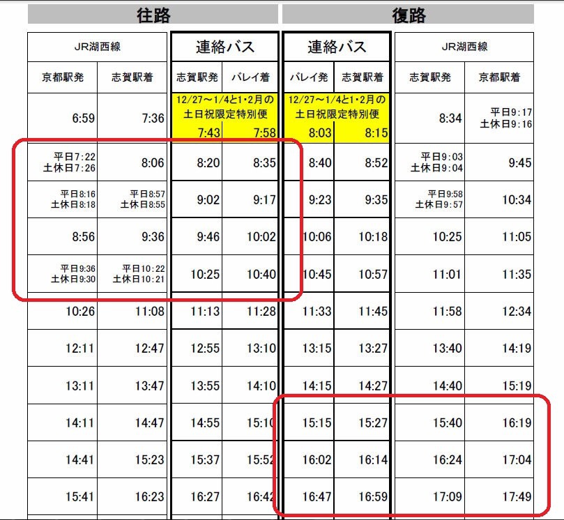 一出站就可以看到滑雪場びわ湖バレイ的接駁巴士,配合著JR班車的時間。說明如下: