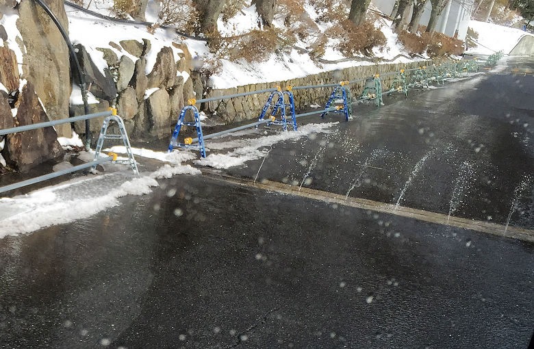 地上每隔一段距離,會有灑水裝置。我亂猜是防止路面結凍,以免車子打滑的作用。