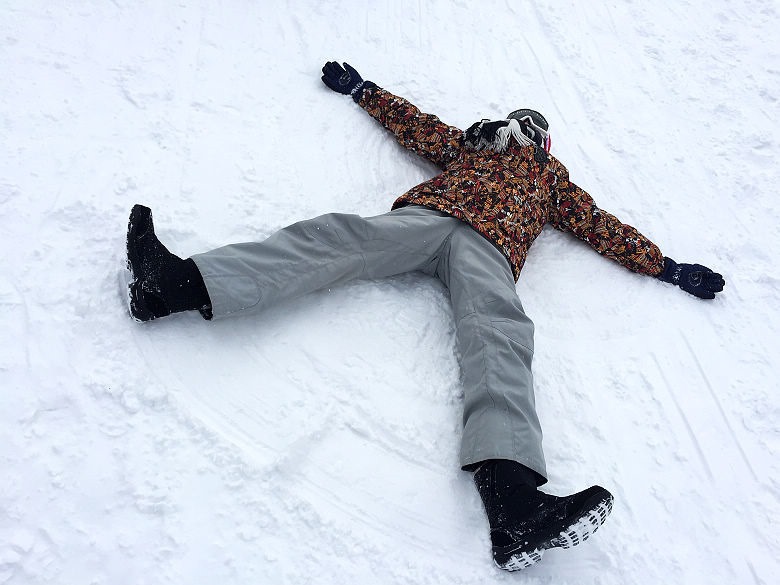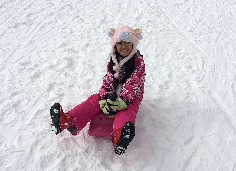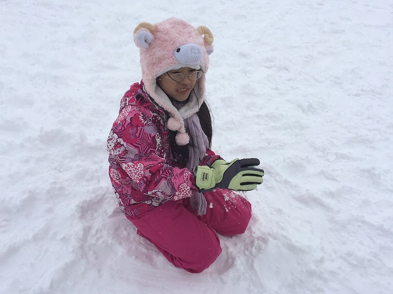 剛開始還不習慣,在雪地裡摔來摔去的,不會很痛,反而覺得很有趣呢!