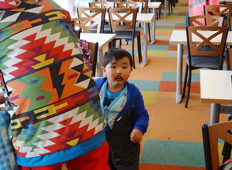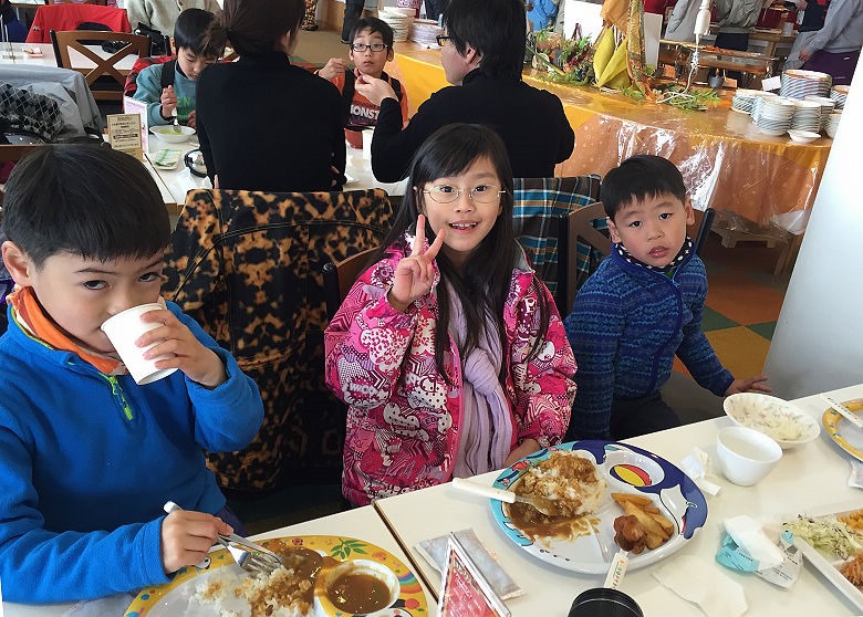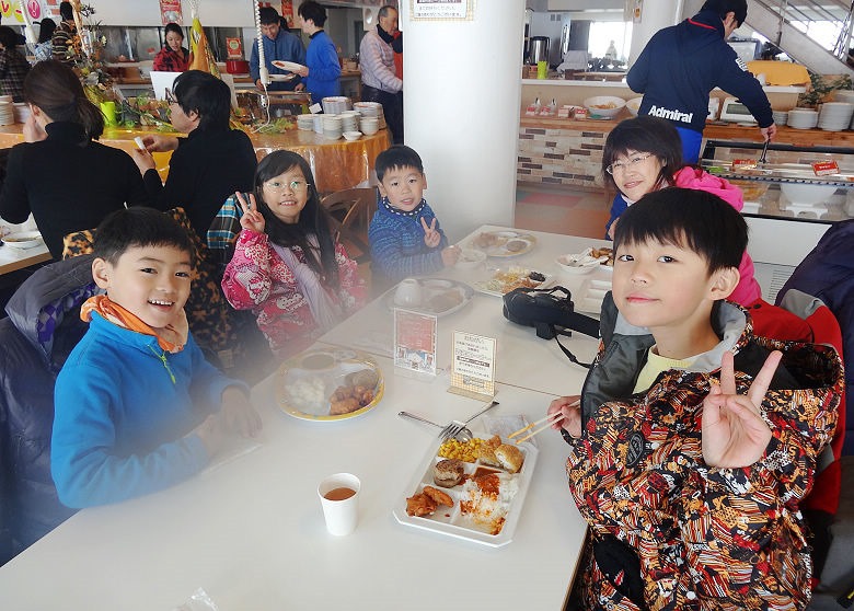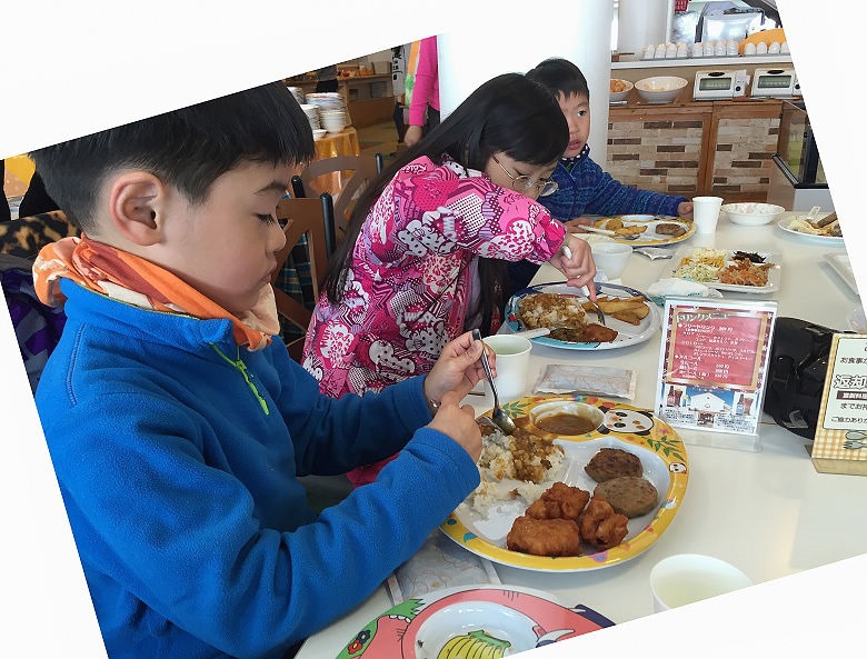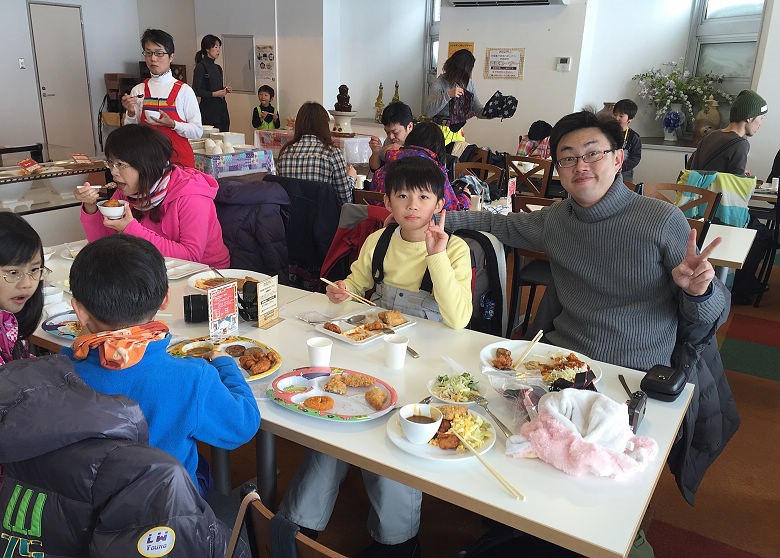 哥哥與爸爸一起享受美食之餘,評論美食、回味玩雪的心得,偶而加入弟弟妹妹們的童稚討論,