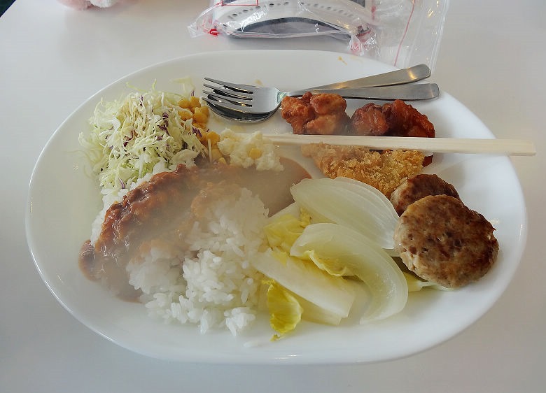 中間的餐檯有日式炸雞、漢堡排與炸馬鈴薯,排邊還有一鍋適合小孩的咖哩與白飯。