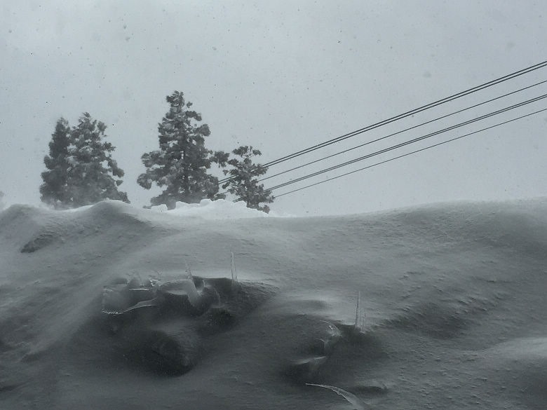 落地窗外積雪遮住一半視線,可以看出外面風雪很大。我們正好在溫暖的室內休息用餐,很幸福。