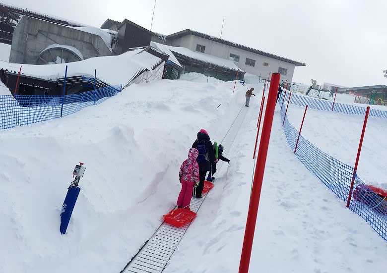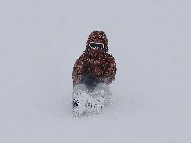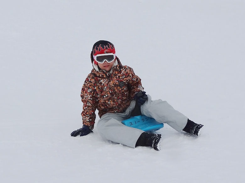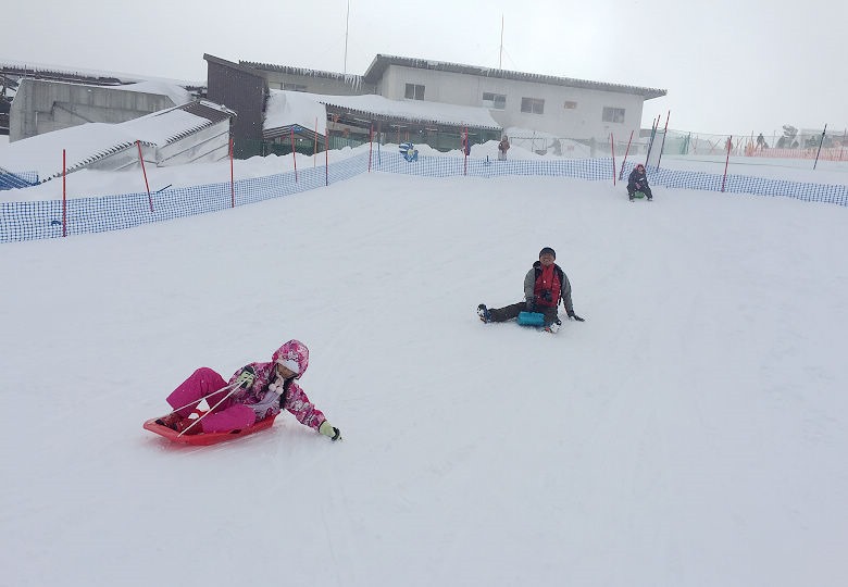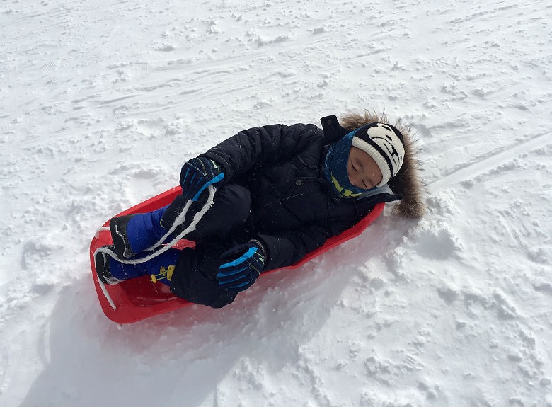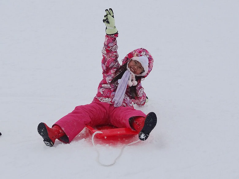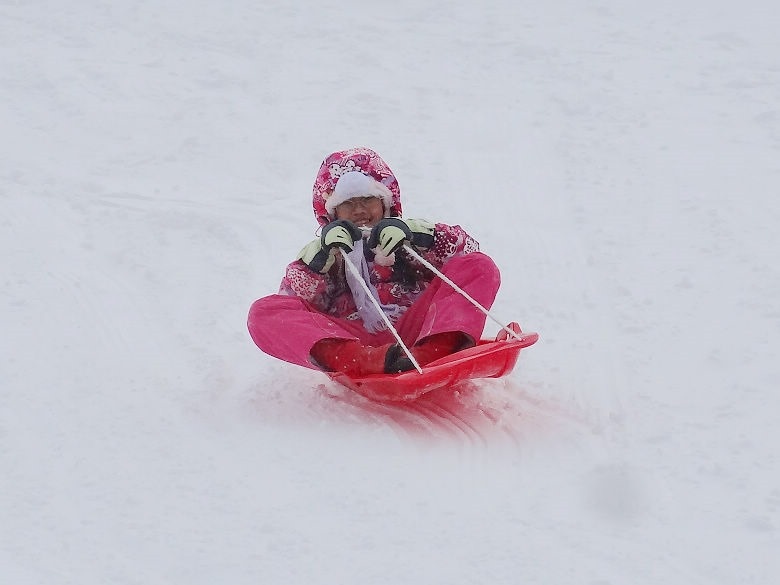 無論是大人或小孩,一樣玩得很盡興。妹妹已經玩出心得,用手左右撥弄雪地可以控制方向。