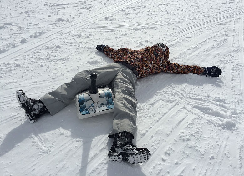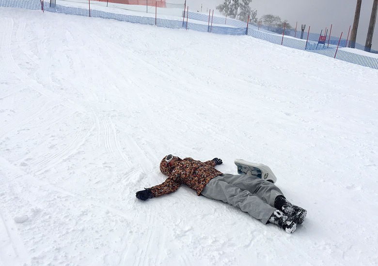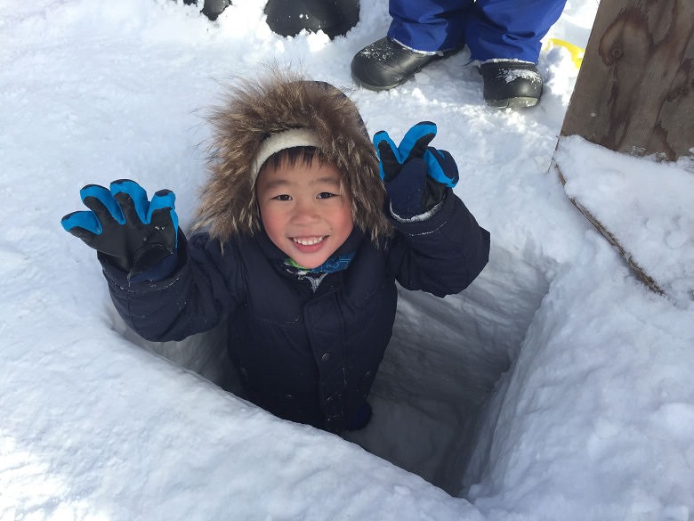 躺在雪地的感覺很不一樣,哥哥常常喜歡玩這動作。這套雪衣租得很有價值呢!