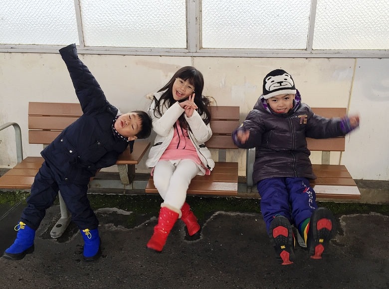 車站外還飄著陣陣的雪花,剛好遇到當地的小學生放學,或是活動,也在排隊等搭電車。