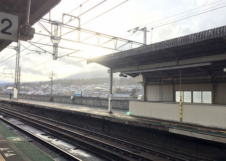 月台上,透過西斜落日,飄落的雪花顯得十分美麗,靜靜地飄落在這平和的小鎮上。