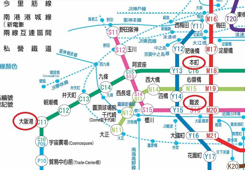 從難波站要去海遊館,先搭紅色的御堂筋線到本町,再轉搭綠色的中央線往大阪港站下車。