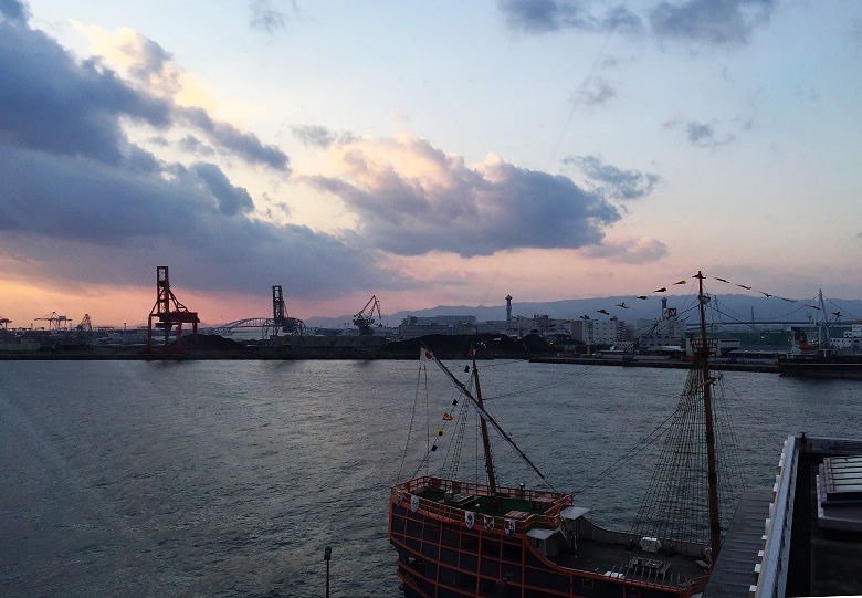 窗外的天氣雖然不錯,天色已漸漸變暗。大阪港裡停靠的觀光船,落日餘暉中顯現復古的異國情調。