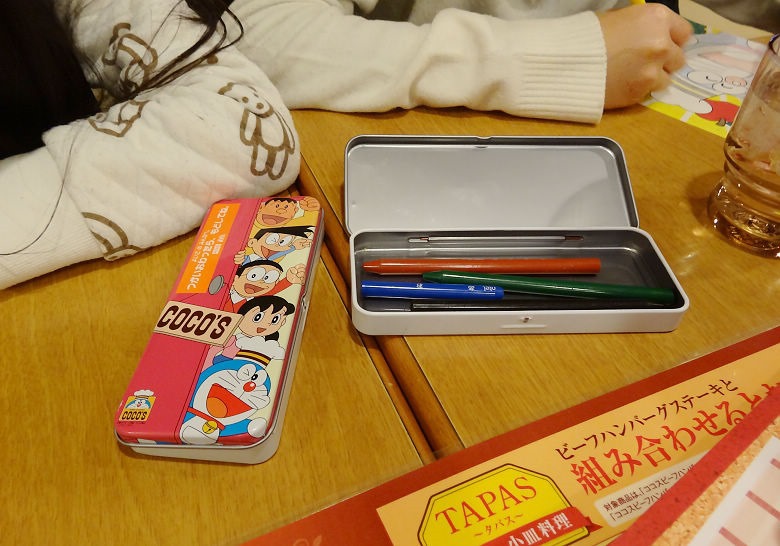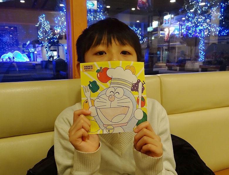 著色紙是一張多啦A夢的卡通圖,圖形很簡單,給0-12歲都可以塗鴉,開心又不影響用餐。