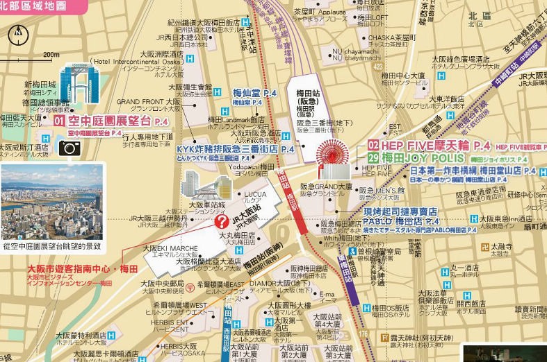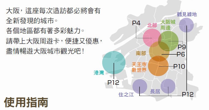 購買大阪周遊卡時,隨卡會附上一本手冊,手冊裡將大阪市區分成北部地區(如上圖)、南部地區、