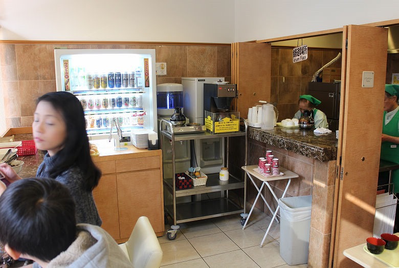再來就是麵包、醬菜、沙拉桌,連自動販賣機都被擋起來利用空間。而且人一多,怪事就來了