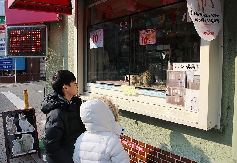 寵物店的窗口就放著貓咪的籠子,正好當活廣告,孩子看得出奇。