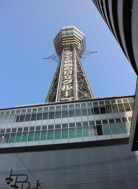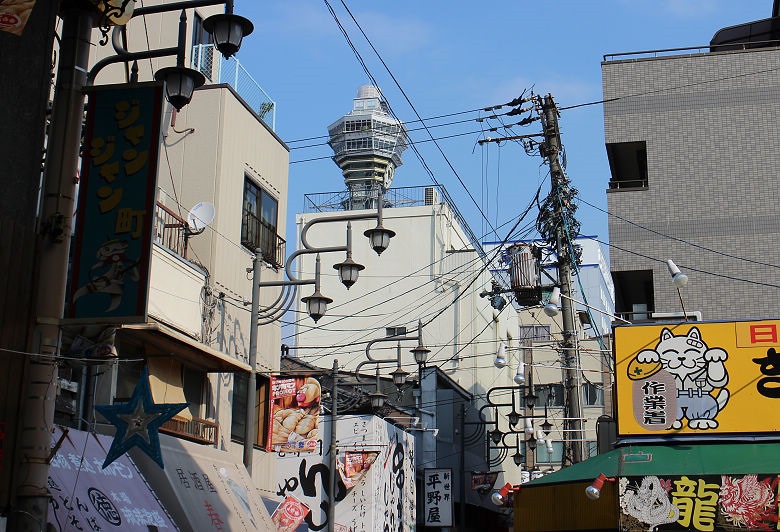 走了一小段,透過複雜的電線桿與交錯的電線,遠遠的可以看到通天閣了。