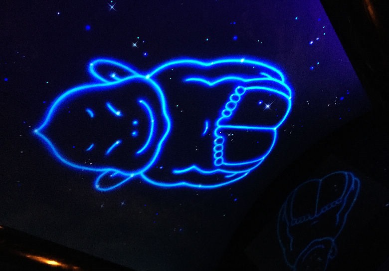 上樓的電梯分兩段,其中一段會有一段黑暗並關燈,天花板有吉祥物夜光造型。
