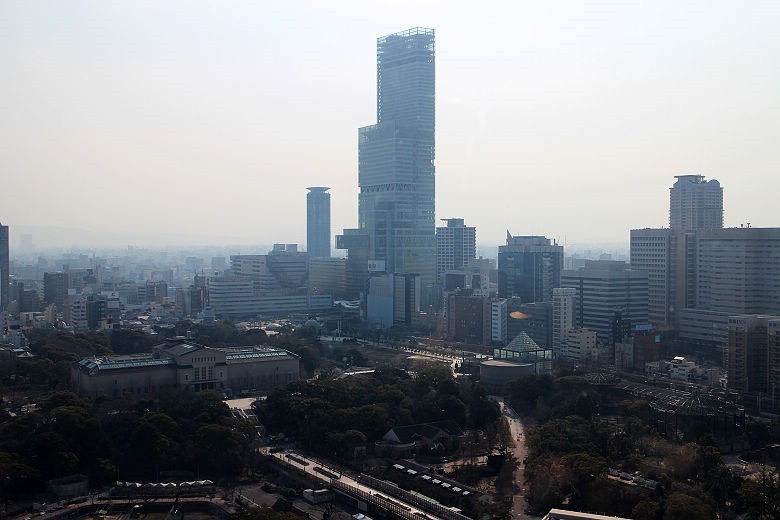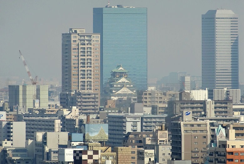是的,眾多高樓大廈群中,大阪城天守閣,看來躲藏其中,很不起眼。實際上是因為太遠的緣故。