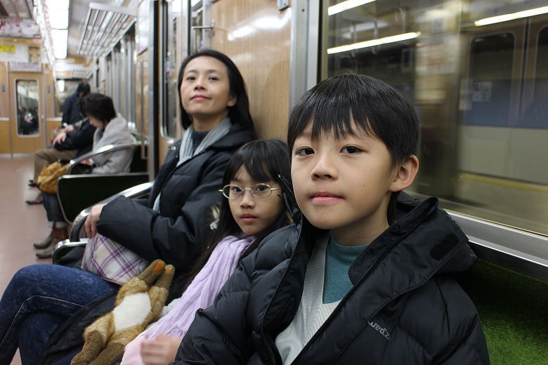 非尖峰時段,搭電車時很輕鬆不會人擠人。堺筋線咖啡色的外表,配上綠色椅墊,很有復古風味。
