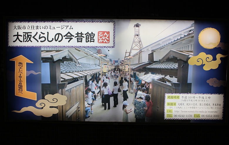 ▲ 到達地鐵站之後下車,通道上就可以看到大阪生活今昔館的廣告看板,開放時間、官網、電話,