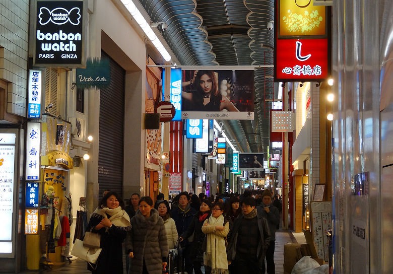▲ 心齋橋的商店街,越晚人越熱鬧,各國語言此起彼落,不外乎是來補貨血拚,手上大包小包的。
