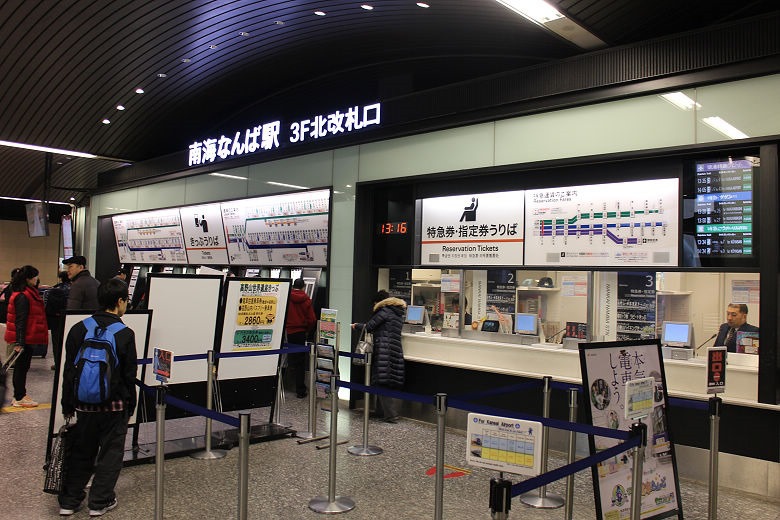 南海電鐵的售票口,右邊是人工售票,左邊是自動販賣機。先試試看左邊吧,反正也不懂日本語,