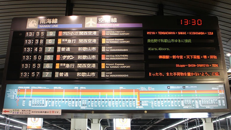 從難波站出發的路線,主要往和歌山、高野山、關西機場,注意一下班車的資訊看板,不難辨認。