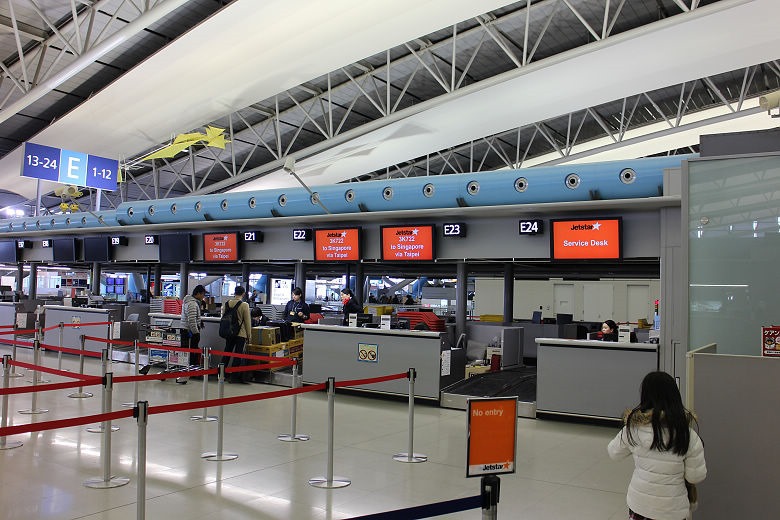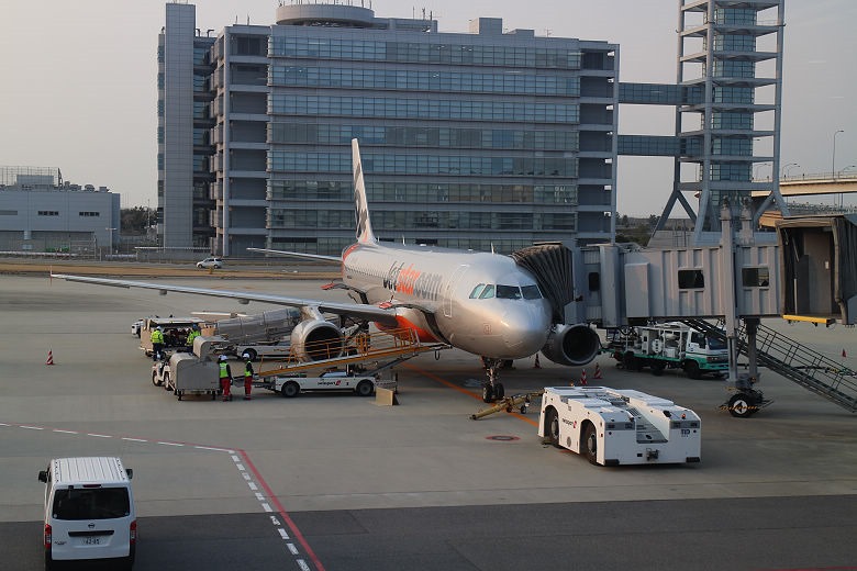 捷星航空在關西機場有租用空橋,讓人有點意外。另外一家廉航樂桃航空,似乎是使用接駁巴士。