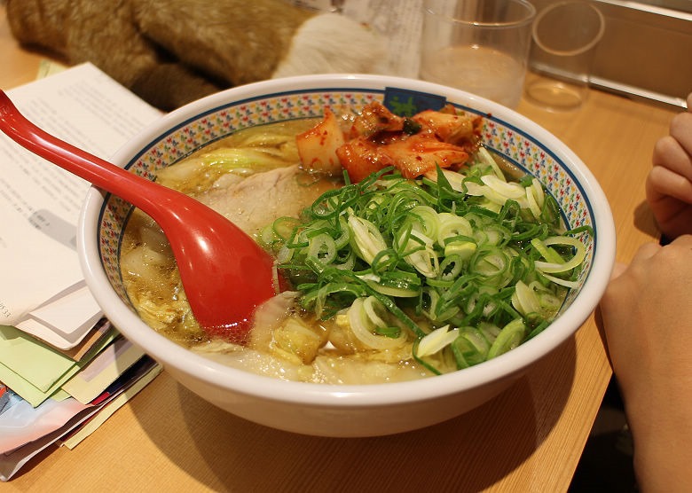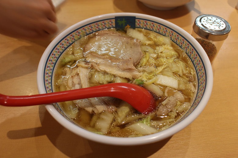 比較像鹽味拉麵,配上大量白菜,口感味香而清爽,湯頭甘甜不油膩。