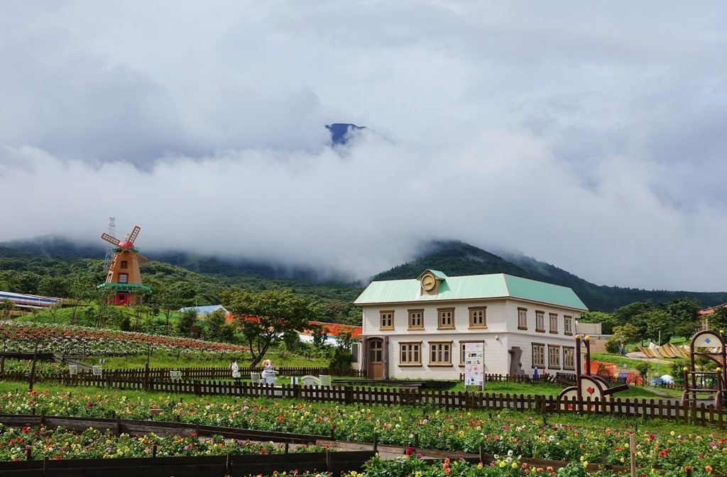 ▲ 雨勢漸小,偶而露出來的山頭不知道是不是富士山?這棟是唯二免費參觀的模型屋,進來看看。