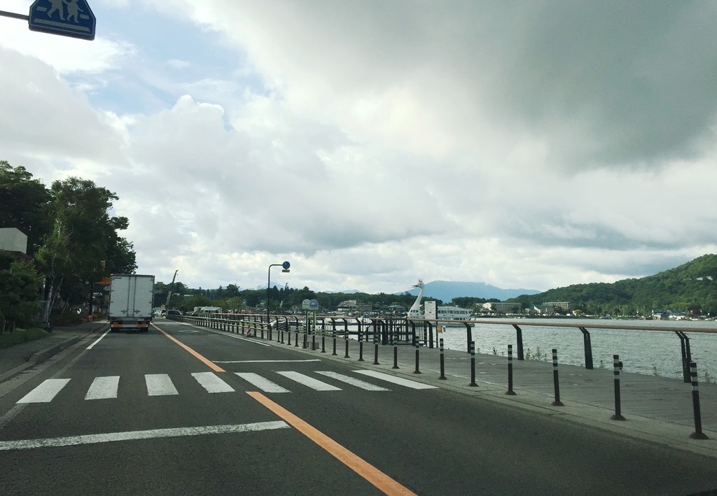 ▲ 開了一段時間終於來到山中湖附近,雖不至於下雨,但是烏雲密布讓人多少有點擔心。