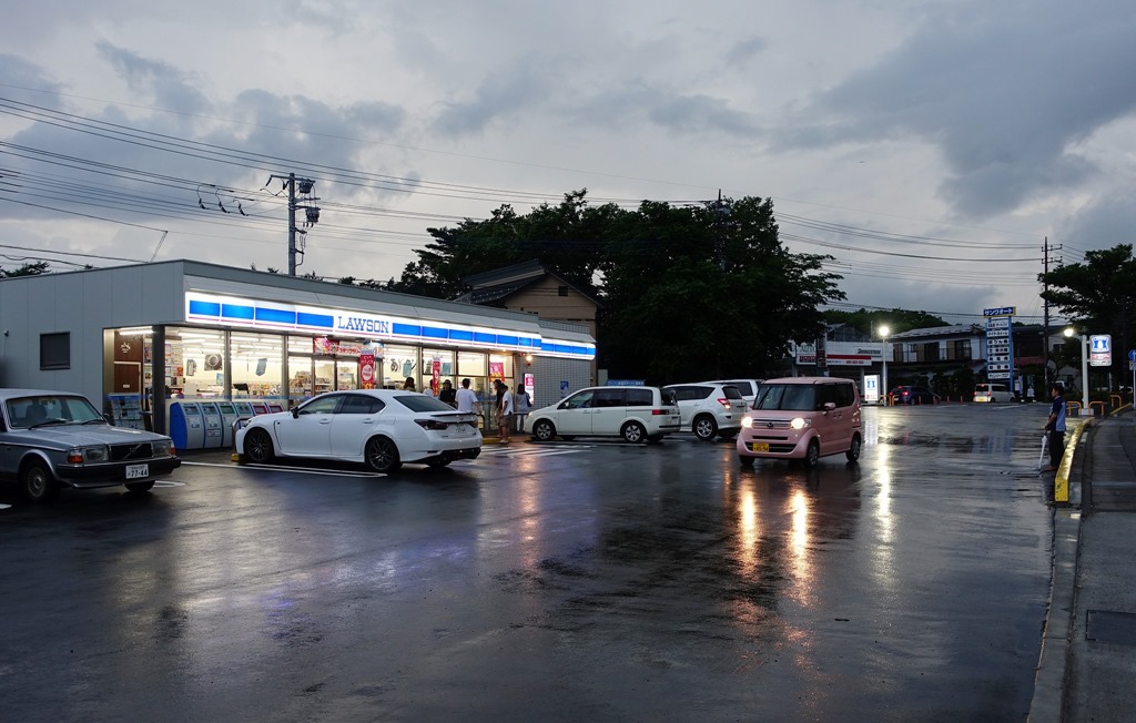▲ 從民宿出來走個100多公尺就有LAWSON便利商店,可以看到地上依然是溼答答的雨水。