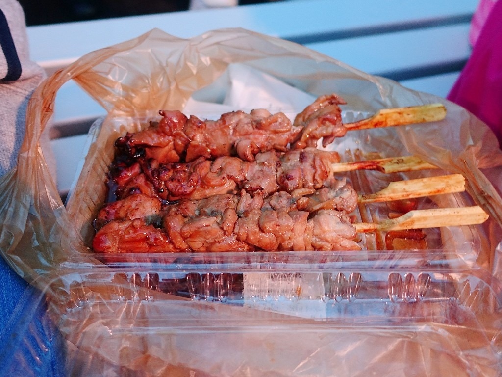▲ 從小吃攤選幾樣喜歡的當晚餐。只是東西買了不知道哪邊可以坐下來用餐?( 在日本不要邊走邊吃 )