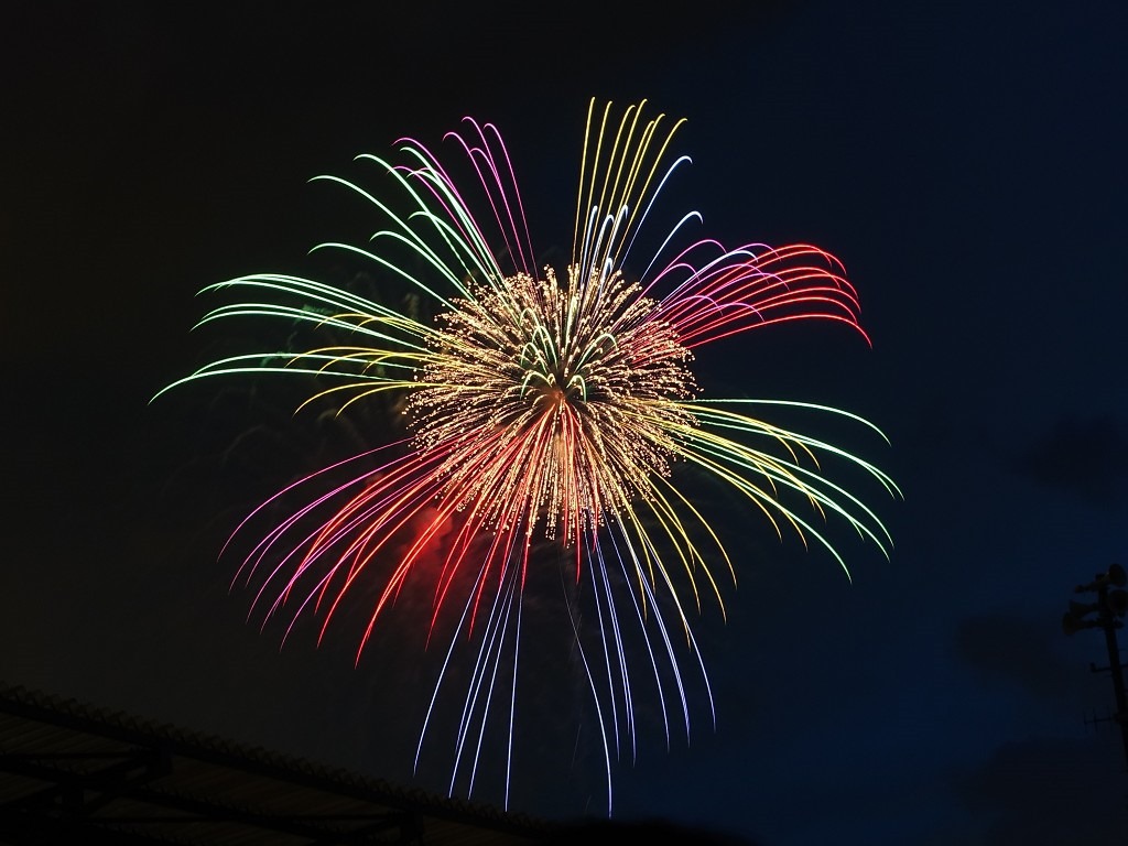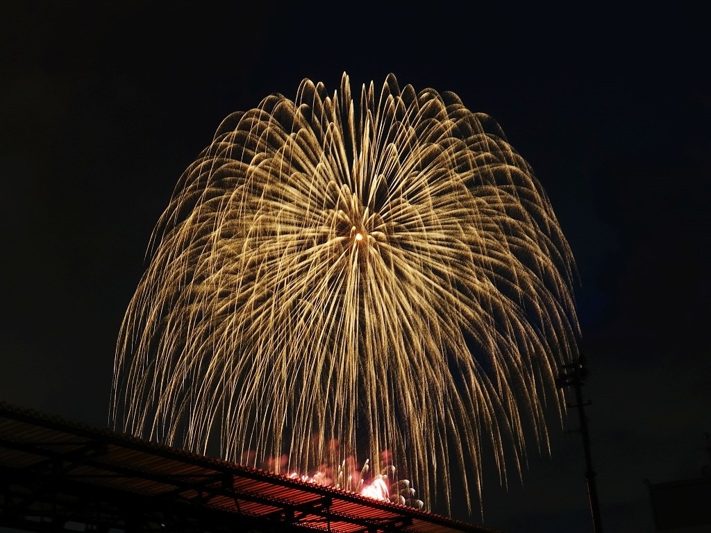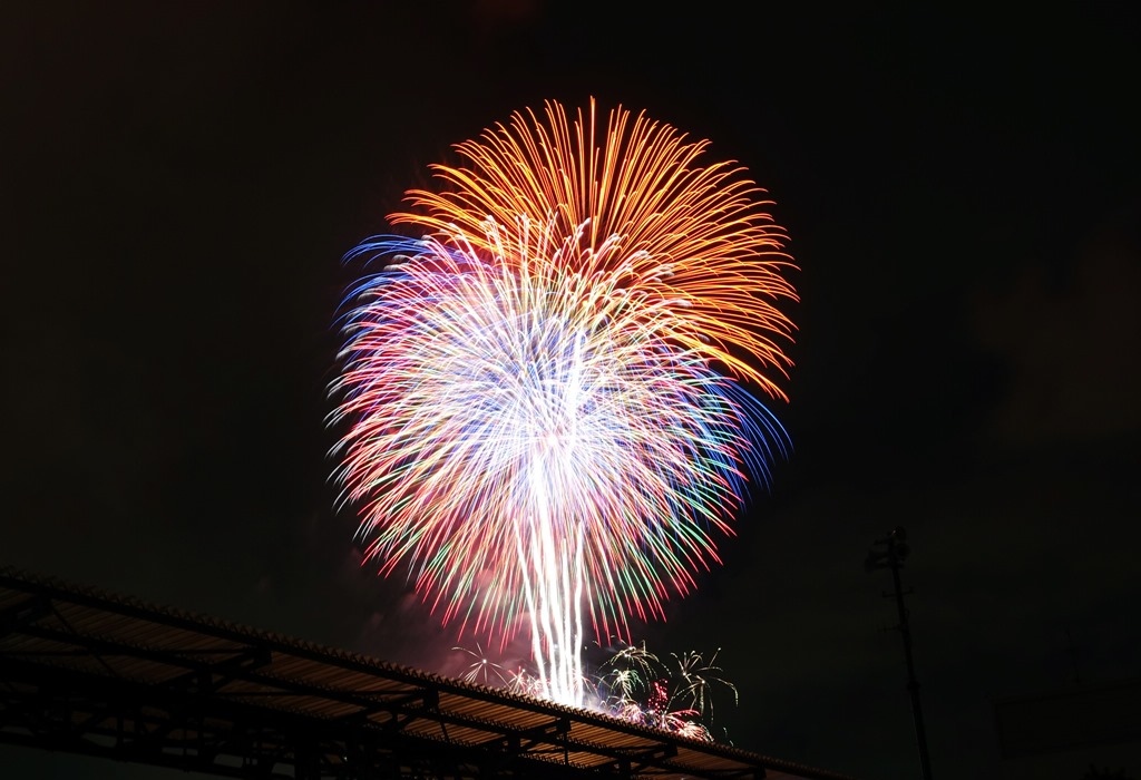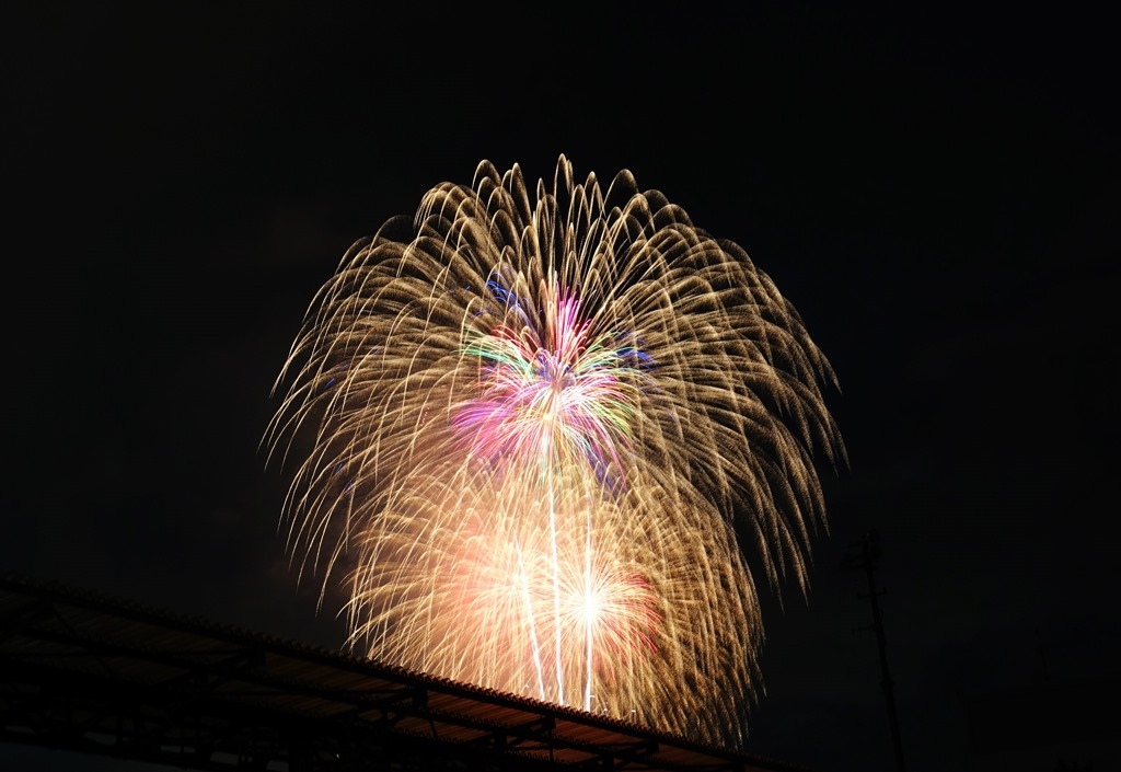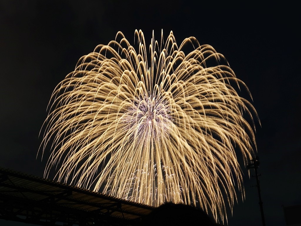 ▲ 打到高空的花火才看得到,低處的花火都被涼亭擋住了。