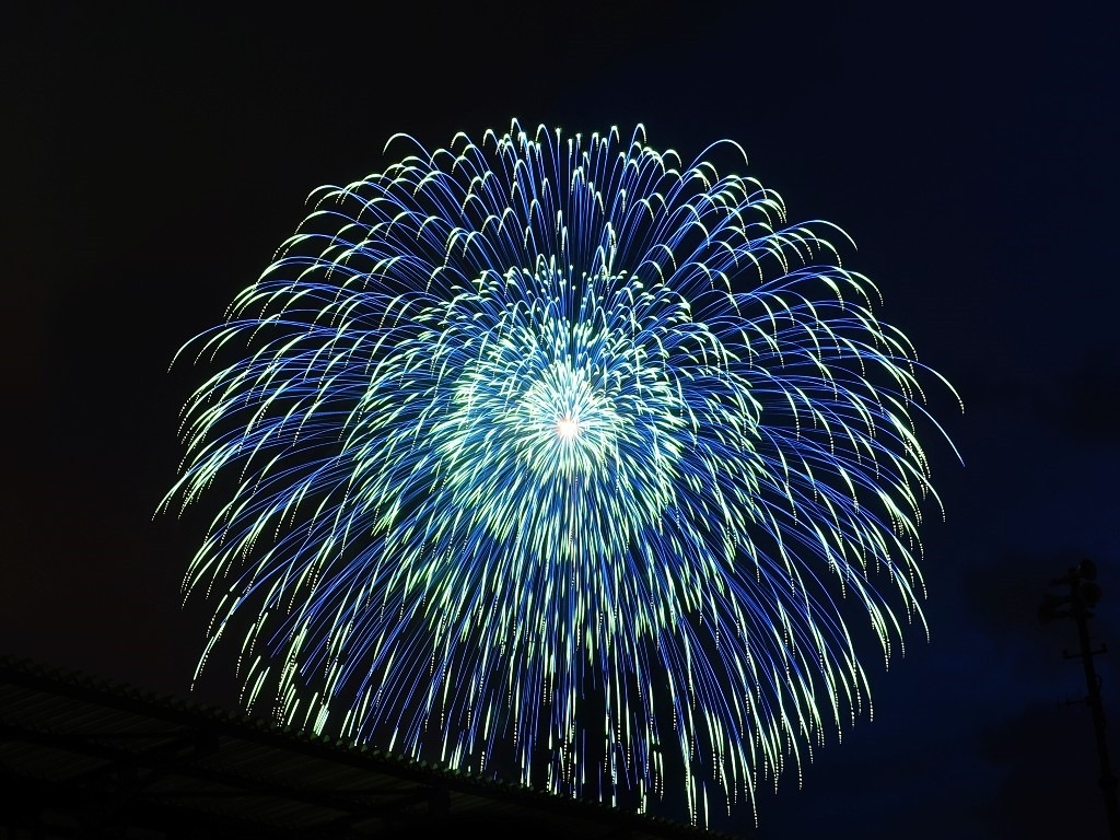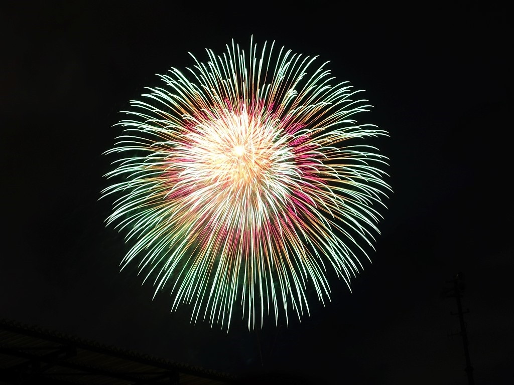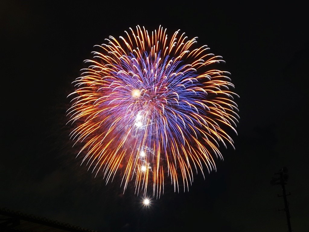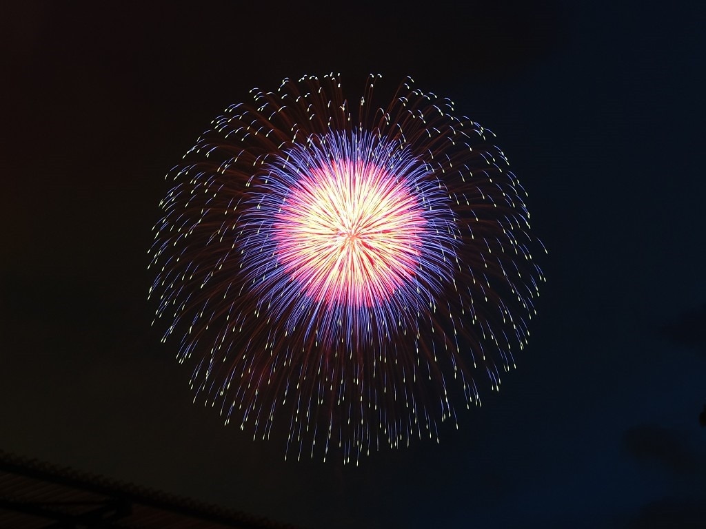 ▲ 打到高空的花火才看得到,低處的花火都被涼亭擋住了。